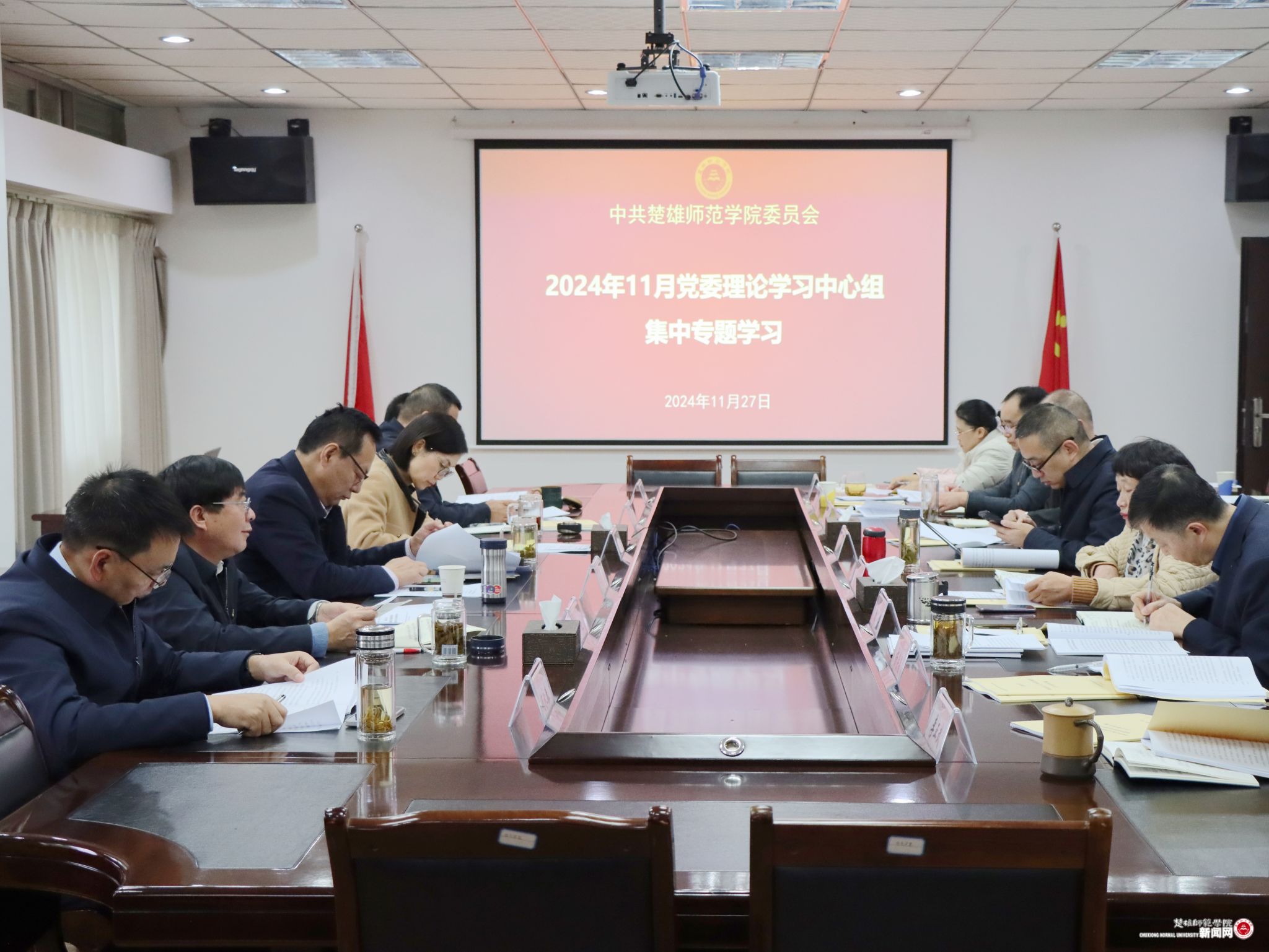 11月27日上午,学校在花果山校区尚行楼第四会议室举行2024年11月党委理论学习中心组集中专题学习。全体党政班子成员、各部门负责人参加学习。学校党委书记王建雄主持会议并讲话。