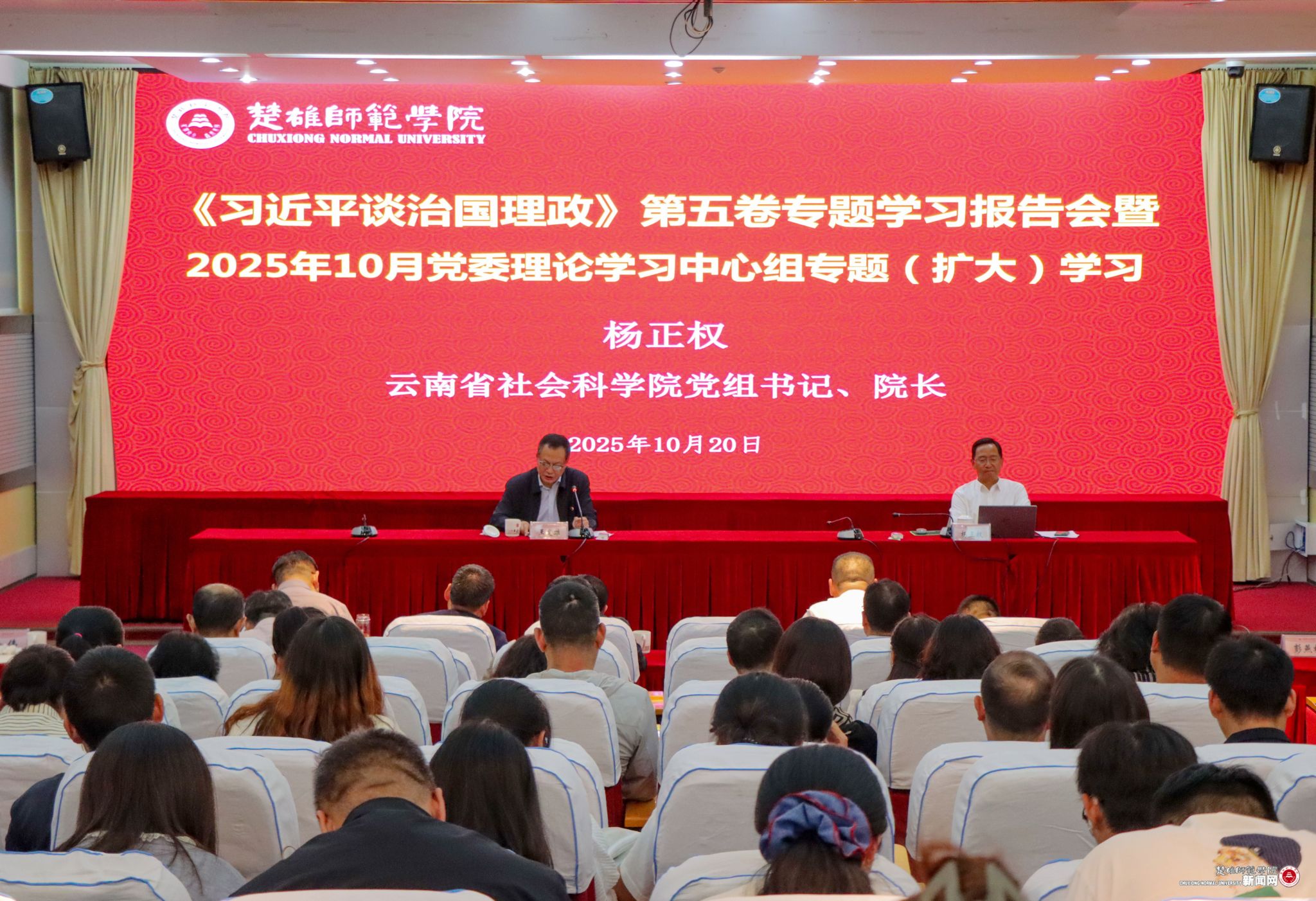 10月20日,学校在花果山校区信息楼第一报告厅举行《习近平谈治国理政》第五卷专题学习报告会暨2025年10月党委理论学习中心组专题(扩大)学习,特邀云南省社会科学院党组书记、院长杨正权到校作“深入学习贯彻《习近平谈治国理政》第五卷”专题辅导。学校党政领导班子成员、全体处级干部、职能部门全体科级干部、2025年青马工程学员代表参加会议。学校党委书记王建雄主持会议并提学习贯彻要求。