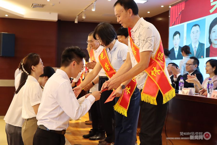 会上,全体师生重温了教育家精神。2024年7月至9月退休教师向2024年新入职教师交付“教育家精神”传承贴。全体与会人员共同观看了硕博毕业返校工作的青年教师录制的祝福短视频《长大后我就成了您》,以及各学院学生代表向老师的祝福短视频《老师您辛苦了》。