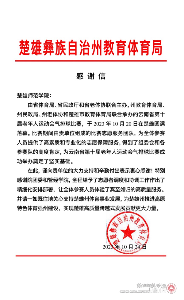 近日,我校收到一封来自楚雄州教育体育局的感谢信,信中高度评价了由校团委和管经学院组成的志愿服务团队在云南省第十届老年人运动会气排球比赛中做出了高素质和专业化的志愿保障服务,让全体参赛人员体验了宾至如归的高质量服务,为本届老年人运动会气排球比赛的成功举办奠定了坚实基础。