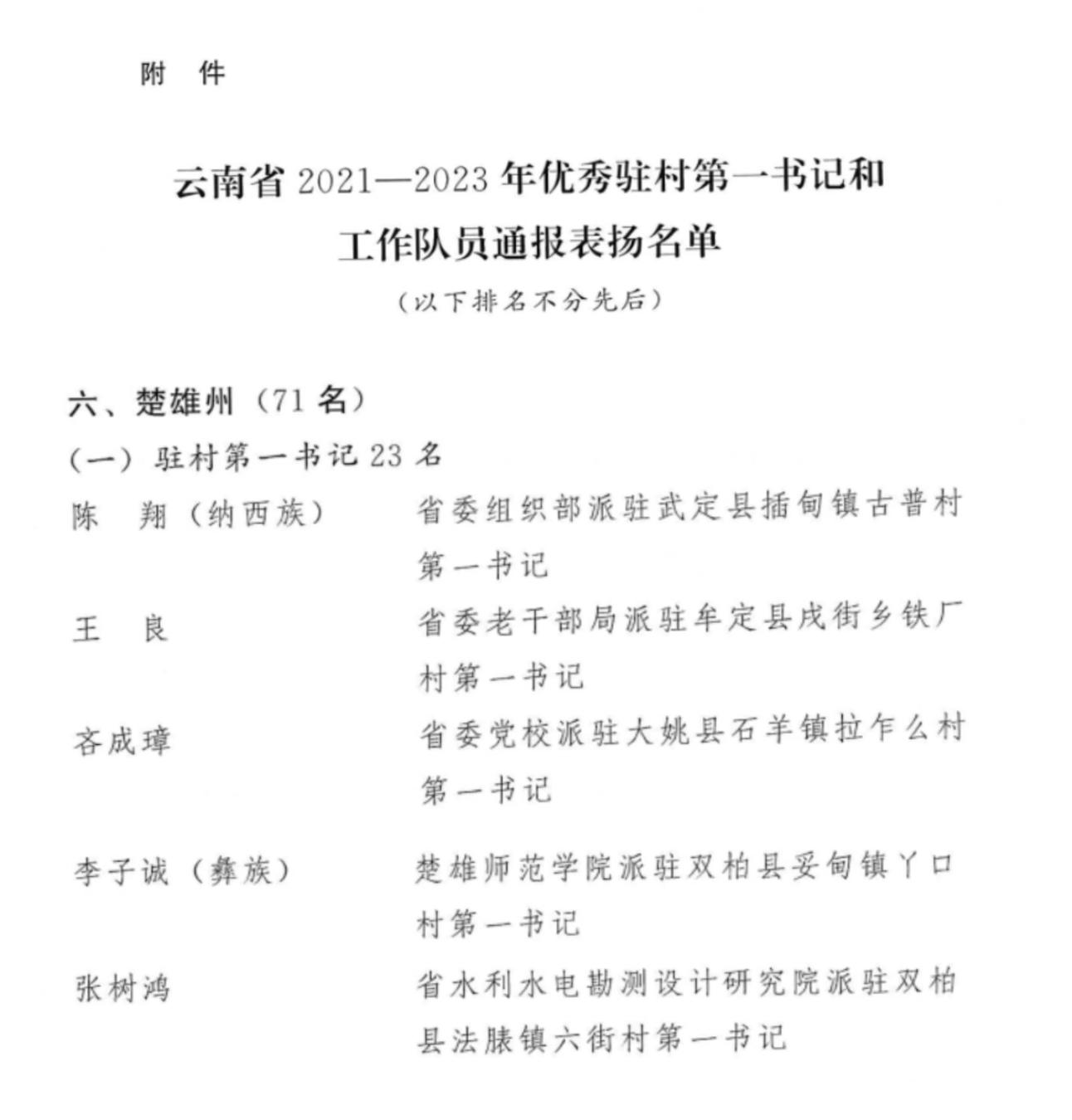 日前,中共云南省委组织部、云南省乡村振兴局联合印发通知,通报表扬984名在2021-2023年驻村工作中扎根一线、履职尽责、知重负重、砥砺奋进的驻村第一书记和工作队员。我校选派驻双柏县妥甸镇丫口村第一书记李子诚同志获通报表扬。