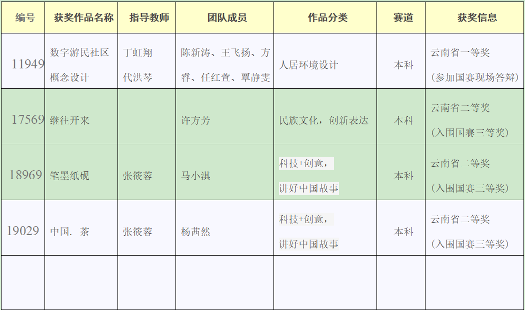 近日,在第十一届全国大学生数字媒体科技作品及创意竞赛(云南省省赛)获奖作品公示名单中,我校美术与艺术设计学院学生获云南省一等奖(参加国赛现场答辩)1项、云南省二等奖(入围国赛三等奖)2项、云南省三等奖11项的好成绩。