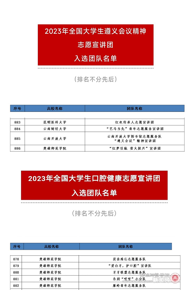 近日,团中央青年志愿者行动指导中心、中共遵义市委、共青团贵州省委近日联合发布了《关于遴选2023年全国大学生遵义会议精神志愿宣讲团的公告》及入选名单;团中央青年志愿者行动指导中心、国家卫生健康委医疗应急司联合发布了《关于遴选2023年全国大学生口腔健康志愿宣讲团的公告》及入选名单。我校积极组织师生参加申报,1支团队入选2023年全国大学生遵义会议精神志愿宣讲团;5支团队入选全国大学生口腔健康志愿宣讲团。下一步,入选团队将按照宣讲计划,认真准备宣讲内容,精心设计宣讲形式,扎实开展好各专项志愿宣讲活动。