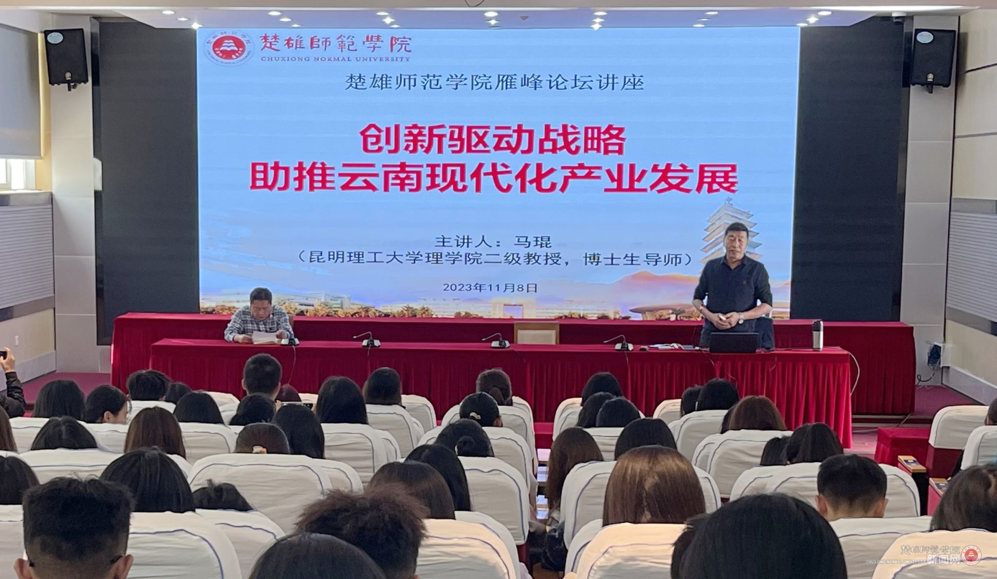 11月8日,我校在花果山校区信息楼一楼第一学术报告厅,举行“雁峰论坛”专题讲座,邀请昆明理工大学理学院二级教授,博士生导师马琨作题为“创新驱动战略助推云南现代化产业发展”的专题报告。本次“雁峰论坛”活动由学校科学技术处、校社科联和科协主办,管经学院协办,由管经学院院长李贵平教授主持。管经学院近200名师生参加了此次“雁峰论坛”学术活动。