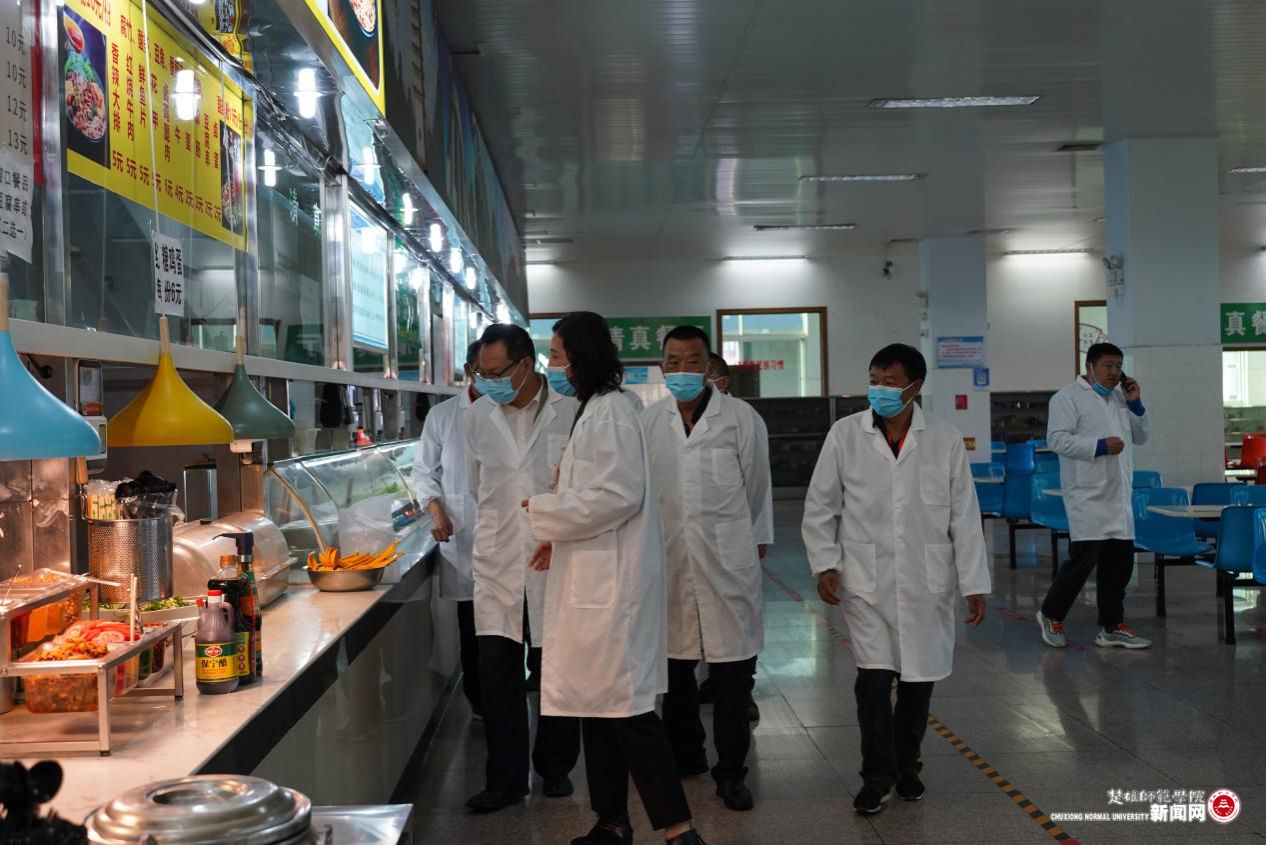 王建雄一行先后到花果山校区学生食堂和阳光美食城详细检查原材料采购及仓库管理、食品保质期、蔬菜农残检测、加工操作流程、售卖及留样、台账管理等情况。
