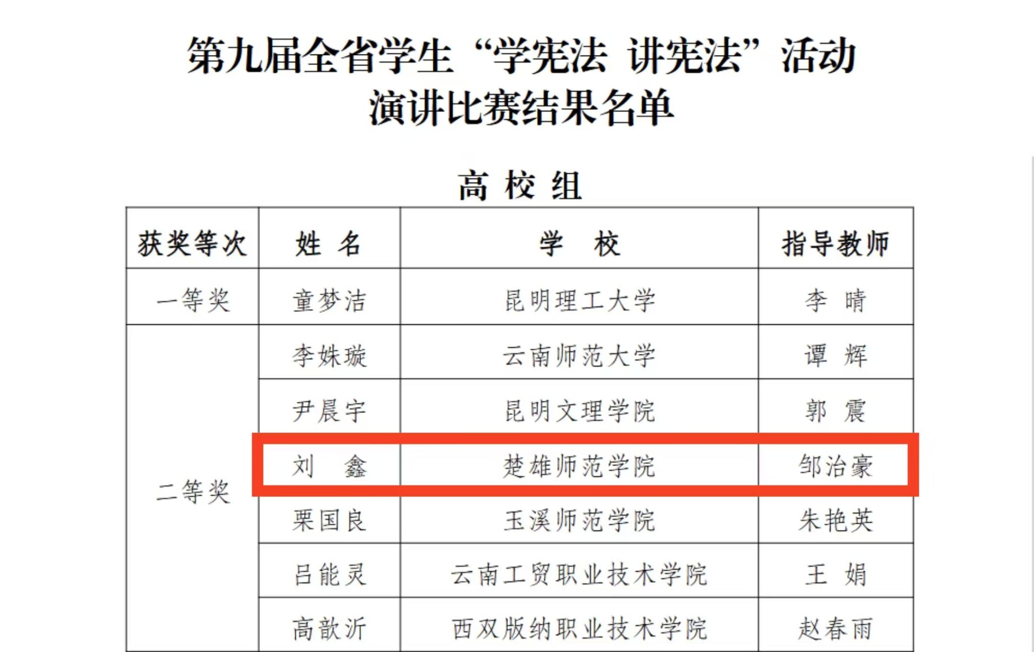 近日,学校在云南省第九届学生“学宪法 讲宪法”活动中获得“优秀组织奖”,这是我校连续第五年荣获该项荣誉。我校语言文化学院2023级汉语言文学专业刘鑫同学荣获云南省第九届学生“学宪法 讲宪法”活动演讲比赛高校组二等奖(指导教师:邹治豪)。