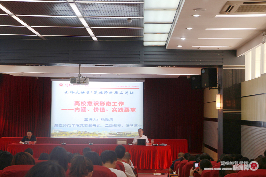 为了加强高校意识形态工作,提升我校干部和师生对意识形态工作的认识水平和处置有关事件的能力,我校于6月21日下午在第一学术报告厅举行“云岭大讲堂˙楚雄师院雁山讲坛”第56期专题讲座,由学校党委副书记、云南省中青年学术技术带头人、二级教授、法学博士杨顺清教授应邀作题为《新发展阶段高校意识形态工作——内涵、价值、实践要求》的专题报告。报告会由学校党委委员、宣传部部长刁国庆主持,全校科级及科级以上干部、各二级党委宣传委员、专职组织员、马克思主义学院全体教师和部分学生近200人参加了报告会。